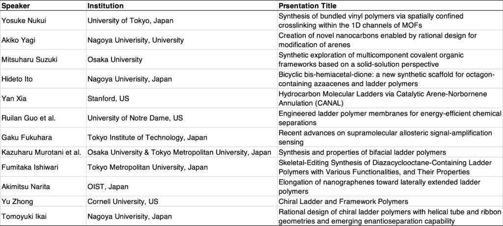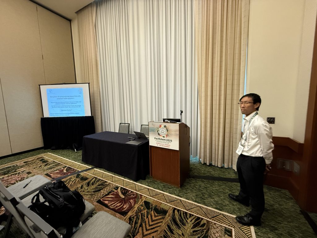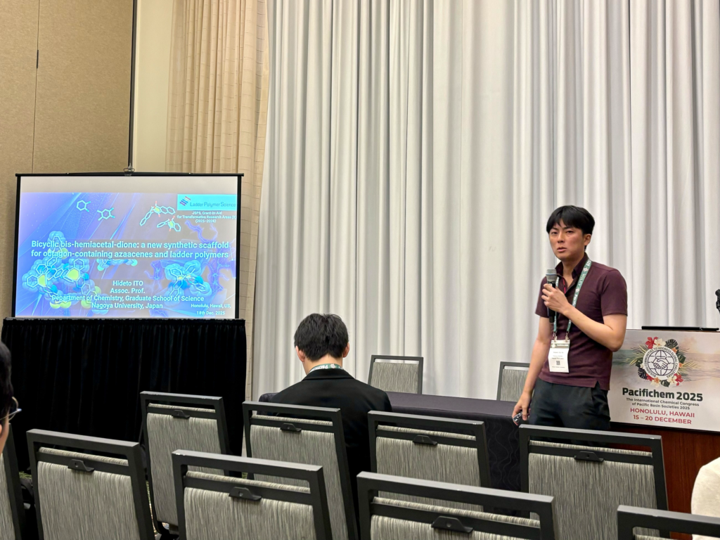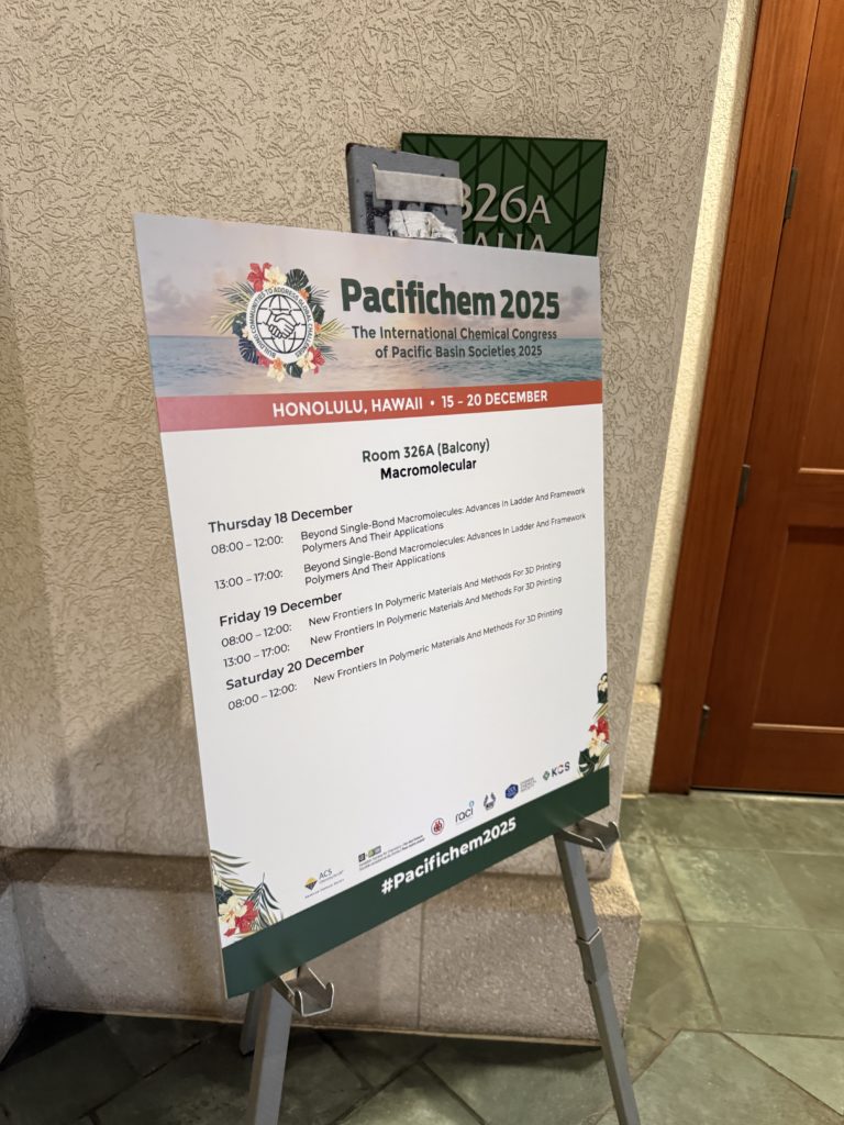 2025年12月15日~21日に米国ハワイ州ホノルル州で5年に一度開催される環太平洋化学国際会議(PACIFICHEM2025)にラダーポリマー科学のメンバーが参加しました。その中で、学変Bラダーポリマー化学としてセッションBeyond Single-Bond Macromolecules: Advances In Ladder And Framework Polymers And Their Applicationsを主催し、12名の方にセッションの講演を、5名の方にポスター発表をしていただきました。発表、聴講でご参加いただいた皆様、ありがとうございました。夜はスピーカーズディナーで交友を深めました。
